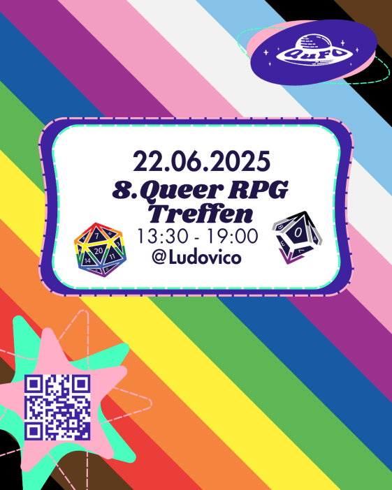 It's time for our 8th queer RPG meeting – and we cooked up something really exciting for Pride month! This time, we'll be playing at Ludovico because instead of our usual 2 RPGs, we'll be offering 4 different one-shots