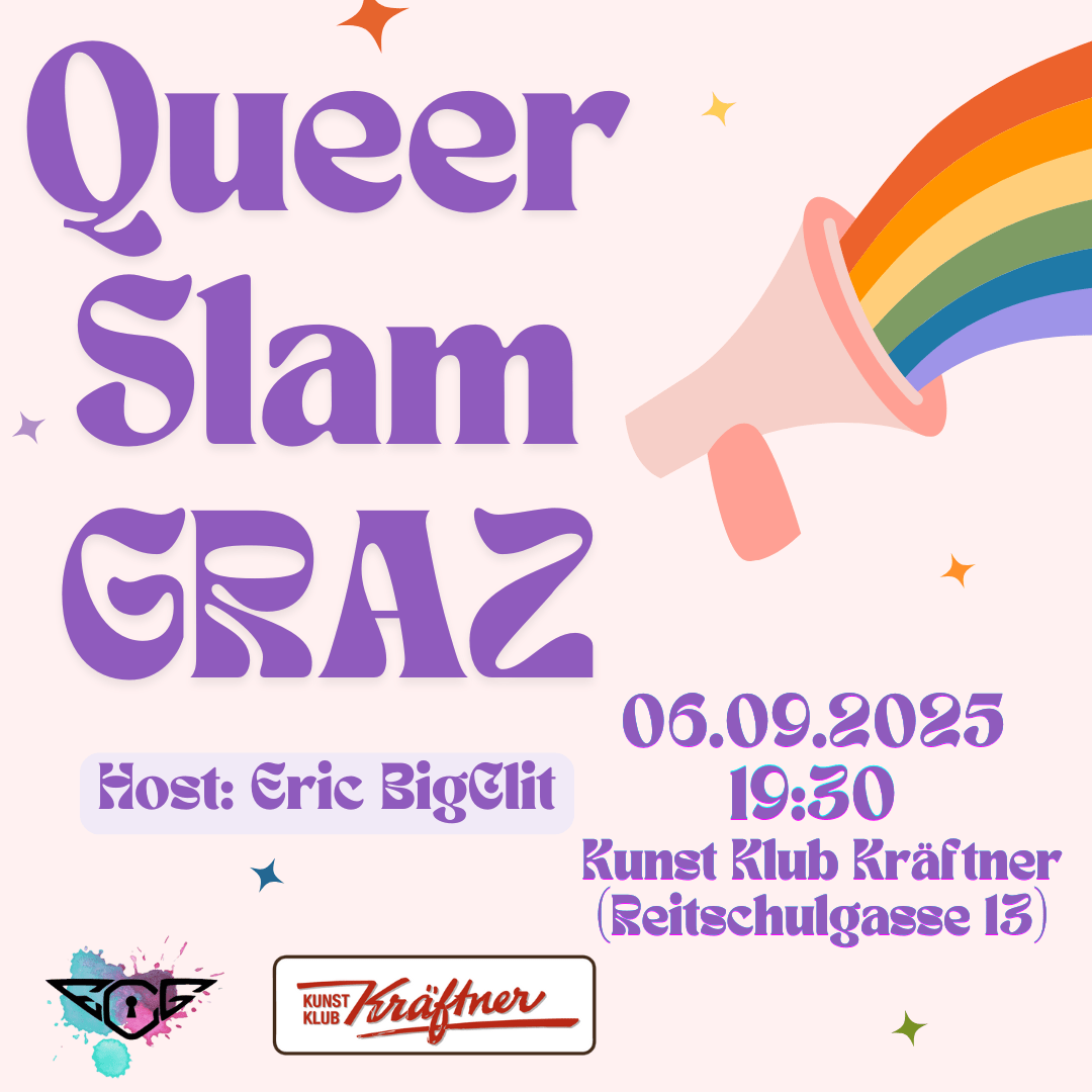 Der QUEER SLAM GRAZ im Kunst Klub Kräftner lädt lokale queere Schreibende ein, selbst verfasste Texte vor einem Publikum vorzutragen. Egal ob Gedicht, Tagebucheintrag, Prosatext, Rap, Minimusical, Spoken-Word oder Poetry-Slam-Text – es sind keine Grenzen gesetzt! Hauptsache das Performte ist selbstgeschrieben! Entgegen eines klassischen Poetry Slams gibt es keine Wertung, nur Liebe ❤️💜
