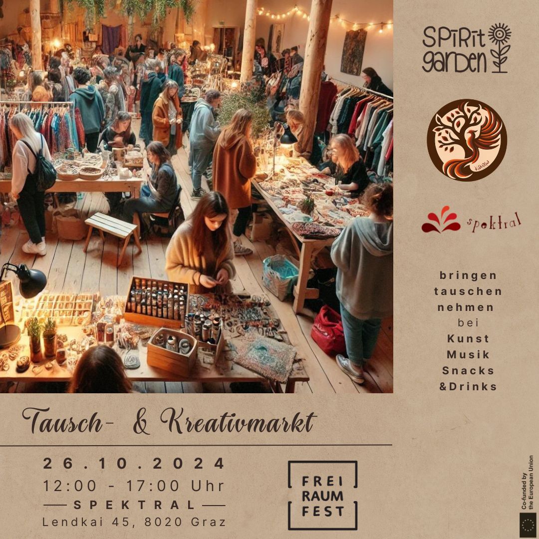 wir laden zum Tausch- & Kreativmarkt am 26.10. von 12-17 Uhr ins Spektral (Lendkai 45, 8020) ein! 🌞 also packt eure nicht verwendeten Kleider & Gegenstände und kommt vorbei! stöbert bei guter Musik 🎶 durch unseren Tauschmarkt ~ genießt unsere veganen Snacks & Drinks 🥪🧉🧁 (Spenden gehen alle ans Projekt & Kollektiv) ~
